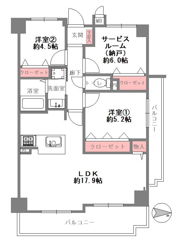 LDK 17.9帖 / 洋室 5.2帖 / S(納戸) 6.0帖 / 洋室 4.5帖 / |